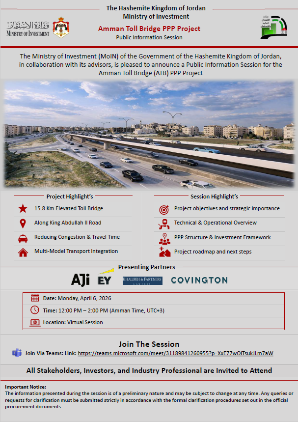 The Ministry of Investment (MoIN) of the Government of the Hashemite Kingdom of Jordan is pleased to announce a Public Information Session for Amman Toll Bridge (ATB) PPP Project.